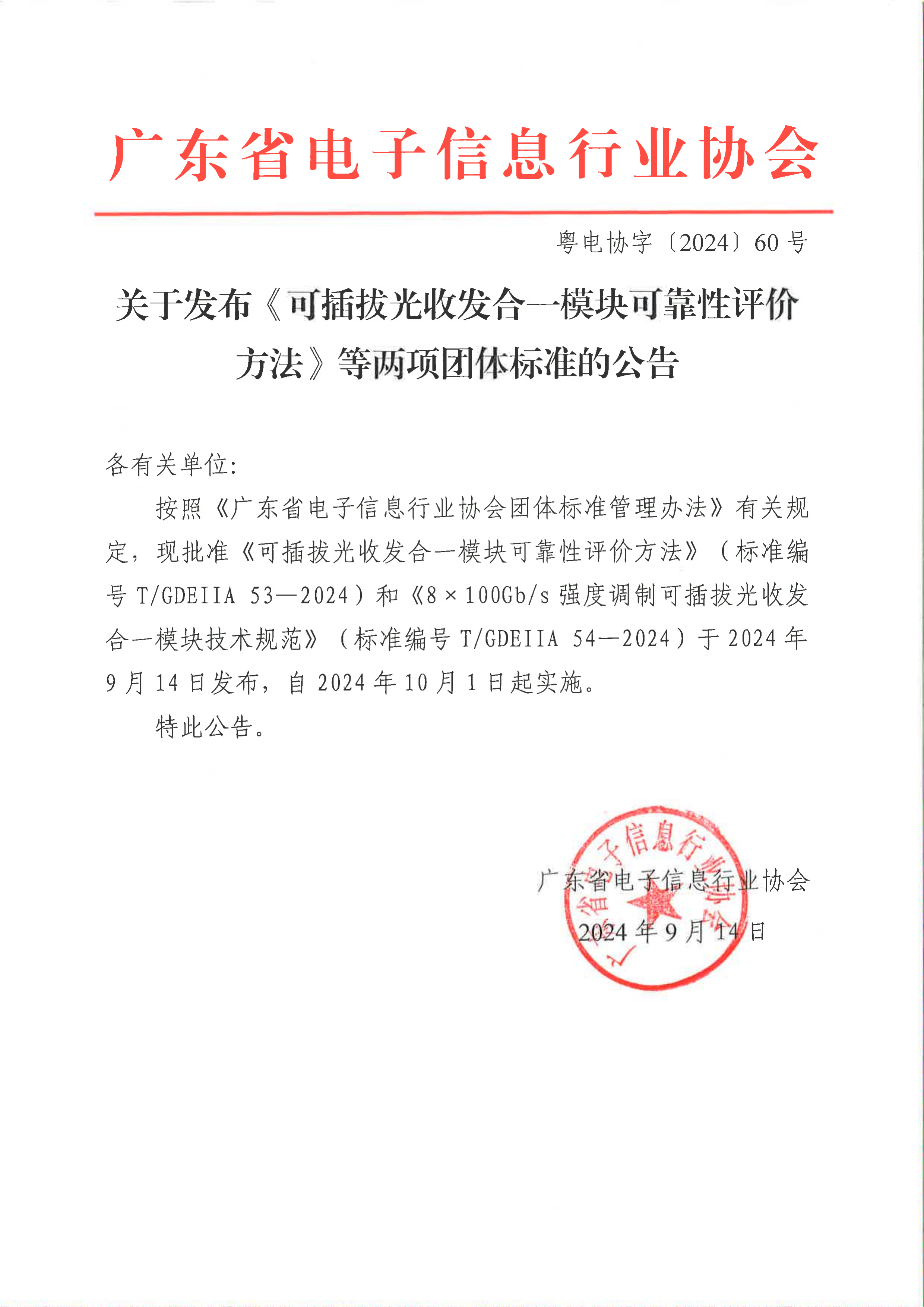 关于发布《可插拔光收发合一模块可靠性评价方法》等2项团体标准的公告