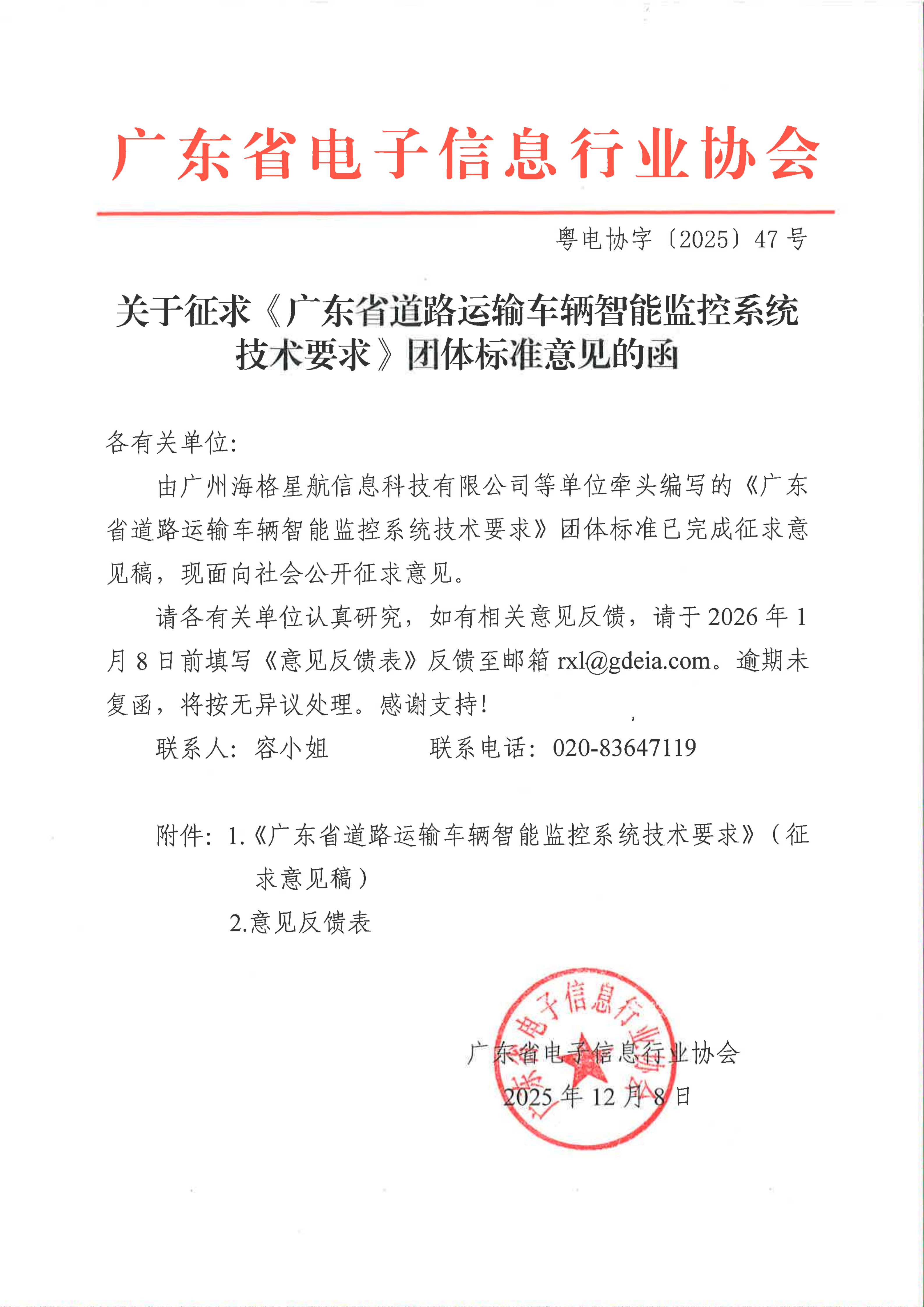 关于征求《广东省道路运输车辆智能监控系统技术要求》团体标准意见的函