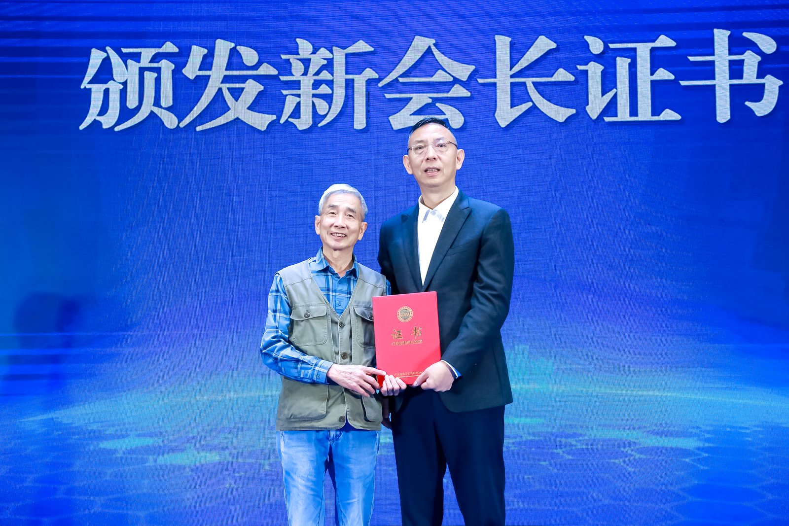 陈国英老会长向喻斌新会长颁发新会长证书