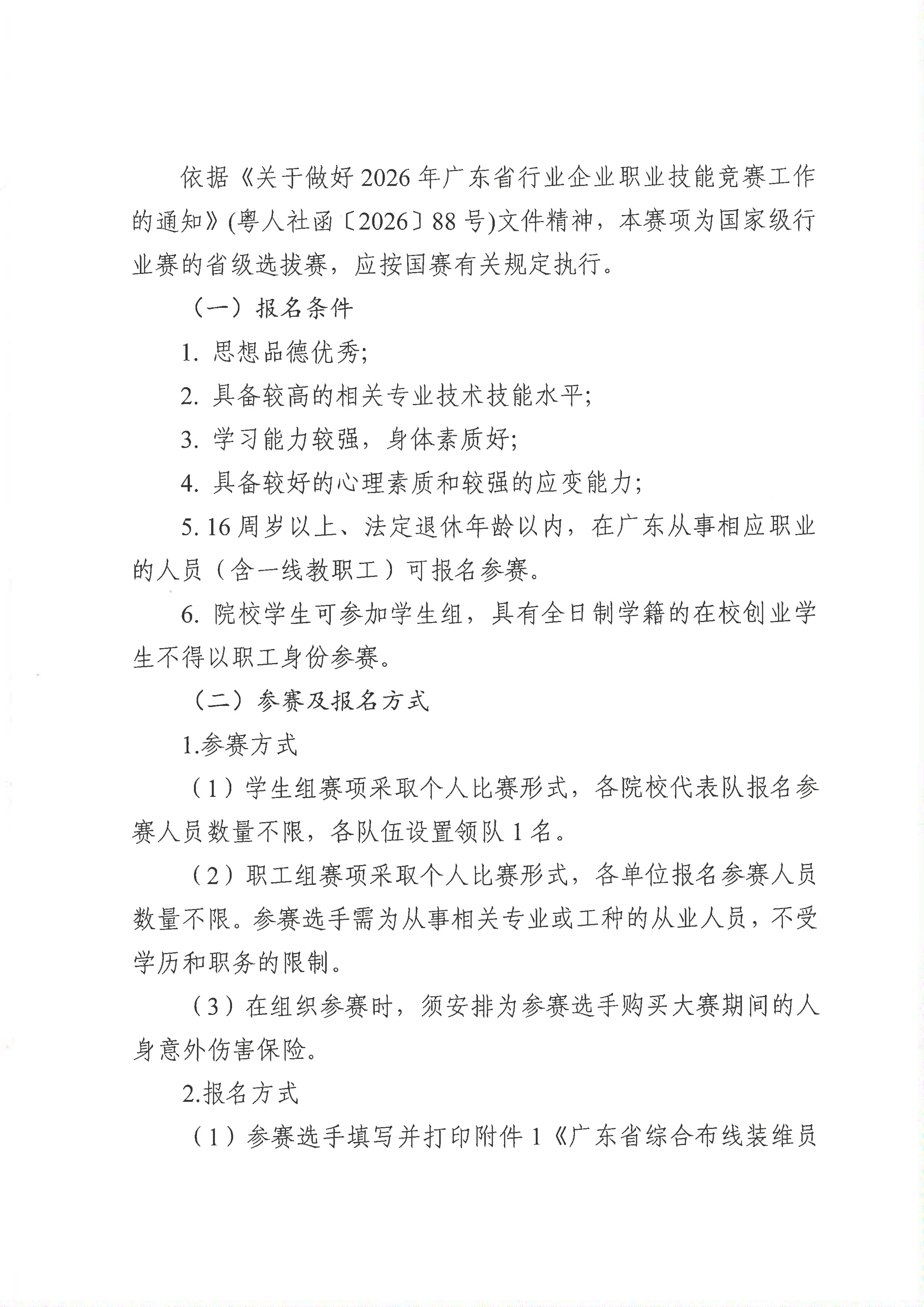 粤电协字〔2026〕23号 关于印发《广东省综合布线装维员职业技能竞赛暨第七届全国电子信息服务业职业技能竞赛综合布线装维员广东省选拔赛组织工作方案》的通知